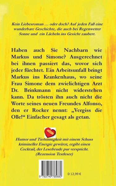 Markus, ein Malocher unterm Herrn, dem es schwerfällt, seiner Gattin Simone, die erfolgreich ein Schuhgeschäft führt, wenigstens ab und zu die ach so gern gehörten drei Worte zu sagen. Ehrlicherweise hat er das schon seit Jahren nicht mehr getan und sie hört eh kaum hin, sollte er mal etwas von sich geben. Sie geht eher mit ihrer Freundin shoppen, wenn er müde nachhause kommt, und am Wochenende ist für ihn Fußball wichtiger als alles andere.Was sie jedoch gemeinsam haben, ist ihr Sohn Matthias, den sie abgöttisch lieben und ihre westfälische Dickköpfigkeit.Haben Sie zufällig Bekannte und Nachbarn wie diese beiden? Dann sollten Sie das Buch lesen, denn ausgerechnet bei ihnen passiert das, wovor sich jeder insgeheim fürchtet. Ein Arbeitsunfall bringt Markus ins Krankenhaus, wo seine Frau Simone dem zwielichtigen Arzt Dr. Brinkmann nicht widerstehen kann. Da trösten ihn auch nicht die Worte seines neuen Freundes Alfonso, den er Rocker nennt: "Vergiss die Olle" Einfacher gesagt als getan.