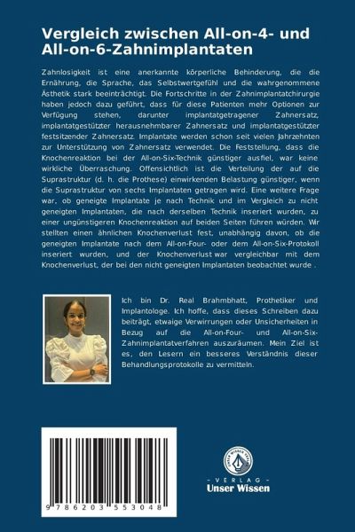 Zahnlosigkeit ist eine anerkannte körperliche Behinderung, die die Ernährung, die Sprache, das Selbstwertgefühl und die wahrgenommene Ästhetik stark beeinträchtigt. Die Fortschritte in der Zahnimplantatchirurgie haben jedoch dazu geführt, dass für diese Patienten mehr Optionen zur Verfügung stehen, darunter implantatgetragener Zahnersatz, implantatgestützter herausnehmbarer Zahnersatz und implantatgestützter festsitzender Zahnersatz. Implantate werden schon seit vielen Jahrzehnten zur Unterstützung von Zahnersatz verwendet. Die Feststellung, dass die Knochenreaktion bei der All-on-Six-Technik günstiger ausfiel, war keine wirkliche Überraschung. Offensichtlich ist die Verteilung der auf die Suprastruktur (d. h. die Prothese) einwirkenden Belastung günstiger, wenn die Suprastruktur von sechs Implantaten getragen wird. Eine weitere Frage war, ob geneigte Implantate je nach Technik und im Vergleich zu nicht geneigten Implantaten, die nach derselben Technik inseriert wurden, zu einer ungünstigeren Knochenreaktion auf beiden Seiten führen würden. Wir stellten einen ähnlichen Knochenverlust fest, unabhängig davon, ob die geneigten Implantate nach dem All-on-Four- oder dem All-on-Six-Protokoll inseriert wurden, und der Knochenverlust war vergleichbar mit dem Knochenverlust, der bei den nicht geneigten Implantaten beobachtet wurde .