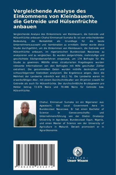 Vergleichende Analyse des Einkommens von Kleinbauern, die Getreide und Hülsenfrüchte anbauen Chahul Emmanuel Sumaka Es ist von entscheidender Bedeutung, die Rentabilität als Grundlage für die beste Unternehmensauswahl und -kombination zu ermitteln. Daher wurde diese Studie durchgeführt, um die Einkommen von Kleinbauern, die Getreide und Hülsenfrüchte anbauen, im nigerianischen Bundesstaat Nasarawa zu analysieren und zu vergleichen. Es wurden zielgerichtete, mehrstufige und geschichtete Stichprobenverfahren eingesetzt, um 174 Befragte für die Studie zu gewinnen. Mithilfe eines strukturierten Fragebogens wurden relevante Informationen von den Befragten mit Hilfe geschulter Zähler extrahiert. Die gesammelten Daten wurden mithilfe deskriptiver und schlussfolgernder Statistiken analysiert. Die Ergebnisse zeigen, dass die Mehrheit der Landwirte männlich war (62,1 %). Die Landwirte waren im erwerbsfähigen Alter, mit einem Durchschnittsalter von 39 Jahren sowohl für Getreide als auch fürHülsenfrüchte. Der durchschnittliche Bruttogewinn pro Hektar betrug 72.676 Naira und 70.446 Naira für Getreide bzw. Hülsenfrüchte.