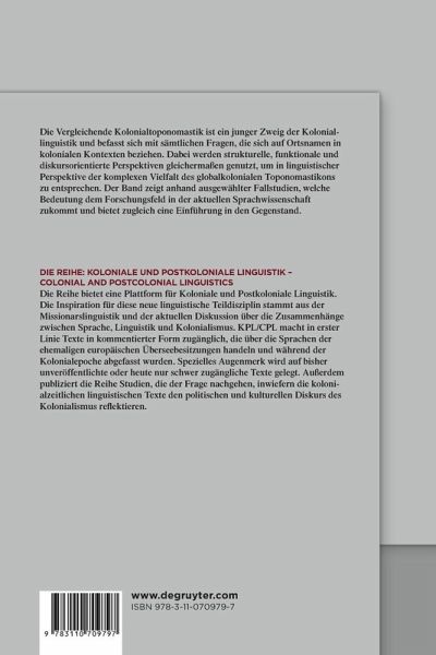 Die Vergleichende Kolonialtoponomastik ist ein junger Zweig der Koloniallinguistik und befasst sich mit sämtlichen Fragen, die sich auf Ortsnamen in kolonialen Kontexten beziehen. Koloniale Ortsnamen, sogenannte Kolonialtoponyme, bilden einen global verteilten und vielsprachigen Datenbestand, der bisher nicht hinreichend erforscht ist. Der Band zeigt anhand ausgewählter Fallstudien und mit dem Anspruch, eine Einführung in den Gegenstand zu geben, welche Bedeutung dem Forschungsfeld in der aktuellen Sprachwissenschaft zukommt. Dabei weist die Vergleichende Kolonialtoponomastik einerseits vielfache Schnittstellen zur Namenkunde überhaupt auf und erweitert diese um einen zentralen Gegenstand der globalen Verflechtungsgeschichten, andererseits ist das Forschungsfeld als wichtiger Bezugspunkt koloniallinguistischer Interessen zu verstehen, weil die Benennung von Raum in Prozessen kolonialer Unterwerfung eine zentrale Herrschaftspraxis darstellt. Der Band zeigt, wie strukturelle, funktionale und diskursorientierte Perspektiven ineinandergreifen, um in linguistischer Perspektive der komplexen Vielfalt des globalkolonialen Toponmastikons entsprechen zu können..