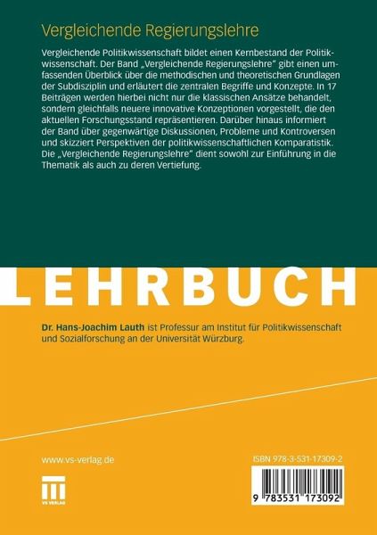 Grundlagen und Methoden.- Gegenstand, grundlegende Kategorien und Forschungsfragen der "Vergleichenden Regierungslehre".- Methoden der Vergleichenden Politikwissenschaft.- Comparing 'Systems' and 'Cultures': Between Universalities, Imperialism, and Indigenousity.- Polity - Strukturen und Institutionen.- Regimetypen: Totalitarismus - Autoritarismus - Demokratie.- Regierungssysteme und Demokratietypen.- Vergleichende Verwaltungswissenschaft: Verwaltungssysteme, Verwaltungskulturen und Verwaltungsreformen in internationaler Perspektive.- Die Europäische Union in der Vergleichenden Politikwissenschaft.- Systemwechsel.- Politics - Akteure und Prozesse.- Parteien und Parteiensysteme.- Wahlen und Wahlsysteme.- Parlamente.- Demokratietypen, institutionelle Dynamik und Interessenvermittlung: Das Konzept der Verhandlungsdemokratie.- Politische Kultur.- Policy - Politikergebnisse und Handlungsbedingungen.- Sozialpolitik.- Umweltpolitik.- Vergleichende Sozialkapitalforschung.- Politikfeldanalyse und Internationale Kooperation.