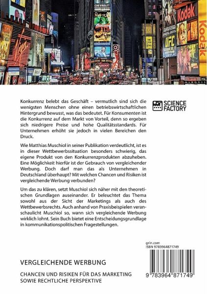 Konkurrenz belebt das Geschäft - vermutlich sind sich die wenigsten Menschen ohne einen betriebswirtschaftlichen Hintergrund bewusst, was das bedeutet. Für Konsumenten ist die Konkurrenz auf dem Markt von Vorteil, denn so ergeben sich niedrigere Preise und hohe Qualitätsstandards. Für Unternehmen erhöht sie jedoch in vielen Bereichen den Druck.Wie Matthias Muschiol in seiner Publikation verdeutlicht, ist es in dieser Wettbewerbssituation besonders schwierig, das eigene Produkt von den Konkurrenzprodukten abzuheben. Eine Möglichkeit hierfür ist der Gebrauch von vergleichender Werbung. Doch darf man das als Unternehmen in Deutschland überhaupt? Mit welchen Chancen und Risiken ist vergleichende Werbung verbunden?Um das zu klären, setzt Muschiol sich näher mit den theoretischen Grundlagen auseinander. Er beleuchtet das Thema sowohl aus der Sicht der Marketings als auch des Wettbewerbsrechts. Auch anhand von Praxisbeispielen veranschaulicht Muschiol so, wann sich vergleichende Werbungwirklich lohnt. Sein Buch bietet eine Entscheidungsgrundlage in kommunikationspolitischen Fragestellungen.Aus dem Inhalt:- Online-Marketing;- Offline-Marketing;- UWG;- Gesetz gegen den unlauteren Wettbewerb;- Bannerwerbung;- Wettbewerb