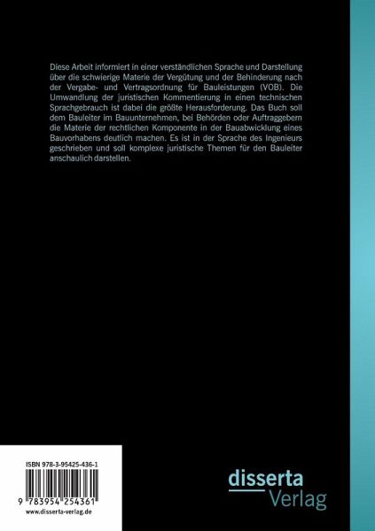 Diese Arbeit informiert in einer verständlichen Sprache und Darstellung über die schwierige Materie der Vergütung und der Behinderung nach der Vergabe- und Vertragsordnung für Bauleistungen (VOB). Die Umwandlung der juristischen Kommentierung in einen technischen Sprachgebrauch ist dabei die größte Herausforderung. Das Buch soll dem Bauleiter im Bauunternehmen, bei Behörden oder Auftraggebern die Materie der rechtlichen Komponente in der Bauabwicklung eines Bauvorhabens deutlich machen. Es ist in der Sprache des Ingenieurs geschrieben und soll komplexe juristische Themen für den Bauleiter anschaulich darstellen.