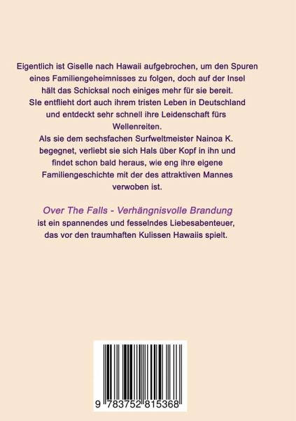 Wichtiger Hinweis: Bitte vermeiden Sie den Doppelkauf! Verhängnisvolle Brandung ist die bearbeitete Neuauflage der bereits 2013 erschienenen Over the falls-Trilogie und beinhaltet die Romane: Das Geheimnis der Brandung, Giselle und der Fluch der Willis und Bis zur letzten Woge. Inhalt:Eigentlich ist Giselle nach Hawaii aufgebrochen, um den Spuren eines Familiengeheimnisses zu folgen, doch auf der Insel hält das Schicksal noch einiges mehr für sie bereit. Sie entflieht dort auch ihrem tristen Leben in Deutschland und entdeckt sehr schnell ihre Leidenschaft fürs Wellenreiten. Als sie dem sechsfachen Surfweltmeister Nainoa K. begegnet, verliebt sie sich Hals über Kopf in ihn und findet schon bald heraus, wie eng ihre eigene Familiengeschichte mit der des attraktiven Mannes verwoben ist. Doch wird diese Liebe immer wieder durch mysteriöse Ereignisse auf eine harte Probe gestellt.Over the falls -Verhängnisvolle Brandung ist ein spannendes und fesselndes Liebesabenteuer, das vor den traumhaften Kulissen Hawaiis spielt.