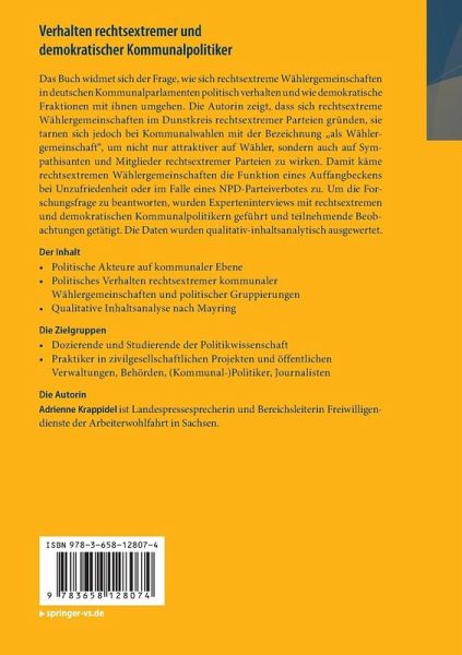 Das Buch widmet sich der Frage, wie sichrechtsextreme Wählergemeinschaften in deutschen Kommunalparlamenten politisch verhaltenund wie demokratische Fraktionen mit ihnen umgehen. Die Autorin zeigt, dass sichrechtsextreme Wählergemeinschaften im Dunstkreis rechtsextremer Parteien gründen,sie tarnen sich jedoch bei Kommunalwahlen mit der Bezeichnung "Wählergemeinschaft",um nicht nur attraktiver auf Wähler, sondern auch auf Sympathisanten undMitglieder rechtsextremer Parteien zu wirken. Damit käme rechtsextremenWählergemeinschaften die Funktion eines Auffangbeckens bei Unzufriedenheit oderim Falle eines NPD-Parteiverbotes zu. Um die Forschungsfrage zu beantworten,wurden Experteninterviews mit rechtsextremen und demokratischenKommunalpolitikern geführt und teilnehmende Beobachtungen getätigt. Die Datenwurden qualitativ-inhaltsanalytisch ausgewertet.