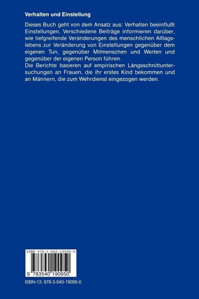 1 Die Beziehung zwischen Verhalten und Einstellung.- Einstellung und Verhalten - eine Grundfrage der Psychologie.- Die Erforschung der Vorhersage von Verhalten aus Einstellungen.- Die Modelle von Fishbein, Ajzen und anderen.- Kritische Betrachtung der Determinationsrichtung "Einstellung beeinflußt Verhalten".- Die Determinationsrichtung "Verhalten beeinflußt Einstellung".- Verhaltensweisen und Einstellungen als Prozesse.- "Verhalten" und "Einstellung" als diskussionsbedürftige Begriffe.- 2 Untersuchung von Einstellungs- und Selbstkonzeptänderung nach Verhaltensänderung.- Verhalten und Einstellung und ihre Veränderung im Alltagsleben.- Die Personengruppen: Mütter und Soldaten.- Untersuchungspläne.- Die untersuchten Personen und die Untersuchungssituationen.- Die Messung des Verhaltens.- Die Erfassung der subjektiven Bedeutung der Verhaltensändernden Ereignisse.- Einstellungsmessung.- Selbstkonzeptmessung.- Strategien der Erfassung der Verhaltens - Einstellungs - Beziehung.- 3 Veränderung von Aktivitäten, ihren Bewertungen und subjektiven Drittvariablen.- Problemstellung.- Datenanalyse.- Veränderungen des Zeitaufwandes für Aktivitäten bei den Frauen.- Veränderungen der Bewertung der Aktivitäten bei den Frauen.- Veränderungen des Zeitaufwandes für Interaktionspartner bei den Frauen.- Veränderungen der Bewertung der Interaktionspartner bei den Frauen.- Veränderungen der Schätzung der Zeitaufwandänderungen bei den Frauen.- Veränderungen des Zeitaufwandes für Aktivitäten bei den Männern.- Veränderungen der Bewertung der Aktivitäten bei den Männern.- Veränderungen des Zeitaufwandes für Interaktionspartner bei den Männern.- Veränderungen der Bewertung der Interaktionspartner bei den Männern.- Veränderungen der subjektivenBedeutung der Mutterschaft.- Veränderungen der subjektiven Bedeutung des Wehrdienstes.- Diskussion.- 4 Veränderung von Selbstkonzepten.- Selbstkonzepte.- Selbstkonzepte und Verhaltensänderung.- "Qualitative" und quantitative Selbstkonzepterfassung.- Die Selbstkonzepterfassung bei Müttern und Soldaten.- Ergebnisse: Selbstkonzeptänderungen bei den Müttern.- Ergebnisse: Selbstkonzeptänderungen bei den Soldaten.- Diskussion.- 5 Veränderung von Werthaltungen und konservativen Einstellungen.- Werthaltungen.- Konservatismus.- Die Messung von Werthaltungen und konservativen Einstellungen.- Ergebnisse: Die Veränderungen von Werthaltungen und konservativen Einstellungen.- Diskussion.- 6 Veränderung individueller Einstellungsstrukturen.- Zur Untersuchung individueller Einstellungsstrukturen.- Die Untersuchungsmethoden: Grid - Test und direkte Ähnlichkeitsurteile.- Die Bestimmung von Repräsentationen individueller Einstellungsstrukturen.- Beispiele für intraindividuelle Vergleiche.- Aggregation der individuellen Lösungen.- Diskussion.- 7 Veränderung von semantischen Urteilsräumen.- Untersuchungsdesign.- Probleme der Veränderung semantischer Strukturen von Einstellungsräumen.- Die Kategorisierung persönlicher Konstrukte im SYMLOG - Raum.- Veränderung individueller Urteilsräume.- Allgemeine Veränderungen der semantischen Urteilsdimensionen.- Diskussion.- 8 In Interviews berichtete Veränderungen.- Vier Monate vor der Geburt des ersten Kindes.- Vier Wochen vor der Geburt.- Sechs Wochen nach der Geburt.- Sechs Monate nach der Geburt.- Ein Jahr nach der Geburt.- Veränderungen bezüglich einzelner Bereiche.- Zusammenfassung.- 9 Verhalten und Einstellung - Zusammenhangsanalysen mit Strukturgleichungsmodellen.- Pfadanalysen mit latenten Variablen.- Der Partial -Least - Squares (PLS) - Ansatz.- Längsschnittdaten und Pfadanalyse.- Zur Situation junger Wehrpflichtiger.- Pfadmodelle der Verhaltens - Einstellungs - Beziehung bei Längsschnittdaten.- Ergebnisse.- Komplexere Pfadmodelle.- Zusammenfassung.- Abschließende Betrachtung.- Literatur.- Autorenregister.