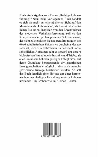 Noch ein Ratgeber zum Thema "Richtige Lebensführung"? Nein, beim vorliegenden Buch handelt es sich vielmehr um eine nüchterne Sicht auf den Menschen als "Lebewesen", als Produkt der natürlichen Evolution. Inspiriert von den Erkenntnissen der modernen Verhaltensforschung, soll es den Kompass unserer philosophischen Selbstreflexion, der durch die neueren Strömungen des öko-kapitalistischen Zeitgeistes durcheinander geraten ist, wieder zurechtrücken. In den recht unterschiedlichen Aufsätzen geht es sowohl um unsere biologischen Wurzeln, wie Instinkte und Triebe, als auch um unsere höheren geistigen Fähigkeiten, auf deren Grundlage herausragende zivilisatorischen Errungenschaften ermöglicht, aber auch manche gravierende Irrwege beschritten wurden. So soll das Buch letztlich einen Beitrag zur einem harmonischen, nachhaltigen Gestaltung unserer Lebensumstände - im Großen wie im Kleinen - leisten. In der vorliegenden 2. Auflage wurde ein ausführlicher Artikel über künstliche Intelligenz(KI) hinzugefügt.