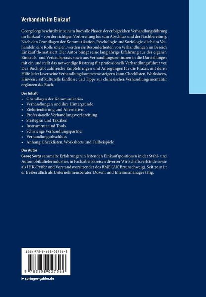 Georg Sorge beschreibt in seinem Buch alle Phasen der erfolgreichen Verhandlungsführung im Einkauf - von der richtigen Vorbereitung bis zum Abschluss und der Nachbereitung. Nach den Grundlagen der Kommunikation, Psychologie und Soziologie, die beim Verhandeln eine Rolle spielen, werden die Besonderheiten von Verhandlungen im Bereich Einkauf thematisiert. Der Autor bringt seine langjährige Erfahrung aus der eigenen Einkaufs- und Verkaufspraxis sowie aus Verhandlungsseminaren in die Darstellungen mit ein und stellt das notwendige Rüstzeug für professionelle Verhandlungsführer vor. Das Buch gibt zahlreiche Empfehlungen und Anregungen für die Praxis, mit deren Hilfe jeder Leser seine Verhandlungskompetenz steigern kann. Checklisten, Worksheets, Hinweise auf kulturelle Einflüsse und Tipps zur chinesischen Verhandlungsmentalität ergänzen das Buch.