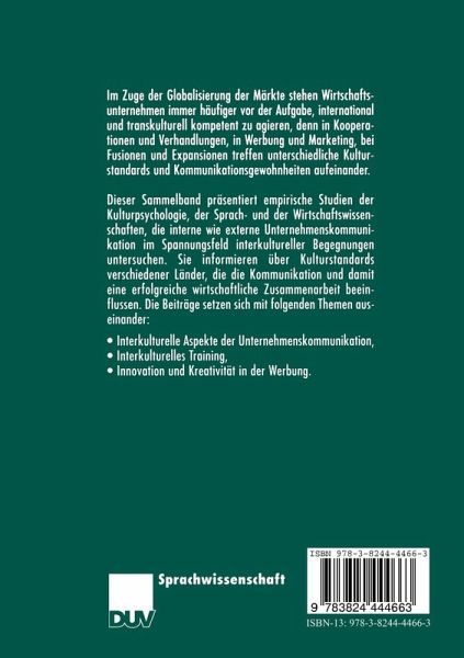 Dieser Sammelband präsentiert empirische Studien der Kulturpsychologie, der Sprach- und der Wirtschaftswissenschaften, die interne wie externe Unternehmenskommunikation im Spannungsfeld interkultureller Begegnungen untersuchen. Sie informieren über Kulturstandards verschiedener Länder, die die Kommunikation und damit eine erfolgreiche wirtschaftliche Zusammenarbeit beeinflussen. Die Beiträge setzen sich mit folgenden Themen auseinander: