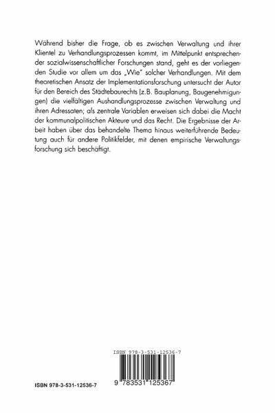 Während bisher die Frage, ob es zwischen Verwaltung und ihrer Klientel zu Verhandlungsprozessen kommt, im Mittelpunkt entsprechender sozialwissenschaftlicher Forschungen stand, geht es dieser Studie vor allem um das "Wie" solcher Verhandlungen. Mit dem theoretischen Ansatz der Implementationsforschung untersucht der Autor für den Bereich des Städtebaurechts (z. B. Bauplanung, Baugenehmigungen) die vielfältigen Aushandlungsprozesse zwischen Verwaltung und ihren Adressaten, als zentrale Variablen erweisen sich dabei die Macht der kommunalpolitischen Akteure und das Recht. Die Ergebnisse dieser Arbeit haben über das behandelte Thema hinaus weiterführende Bedeutung auch für andere Politikfelder, mit denen sich empirische Verwaltungsforschung beschäftigt.