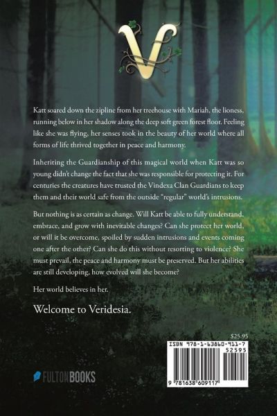 Katt soared down the zipline from her treehouse with Mariah, the lioness, running below in her shadow along the deep soft green forest floor. Feeling like she was flying, her senses took in the beauty of her world where all forms of life thrived together in peace and harmony. Inheriting the Guardianship of this magical world when Katt was so young didn't change the fact that she was responsible for protecting it. For centuries the creatures have trusted the Vindexa Clan Guardians to keep them and their world safe from the outside "regular" world's intrusions. But nothing is as certain as change. Will Katt be able to fully understand, embrace, and grow with inevitable changes? Can she protect her world, or will it be overcome, spoiled by sudden intrusions and events coming one after the other? Can she do this without resorting to violence? She must prevail, the peace and harmony must be preserved. But her abilities are still developing, how evolved will she become? Her world believes in her. Welcome to Veridesia.