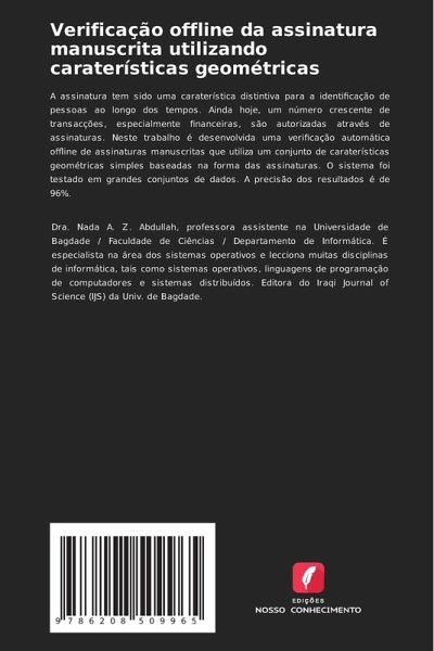A assinatura tem sido uma caraterística distintiva para a identificação de pessoas ao longo dos tempos. Ainda hoje, um número crescente de transacções, especialmente financeiras, são autorizadas através de assinaturas. Neste trabalho é desenvolvida uma verificação automática offline de assinaturas manuscritas que utiliza um conjunto de caraterísticas geométricas simples baseadas na forma das assinaturas. O sistema foi testado em grandes conjuntos de dados. A precisão dos resultados é de 96%.