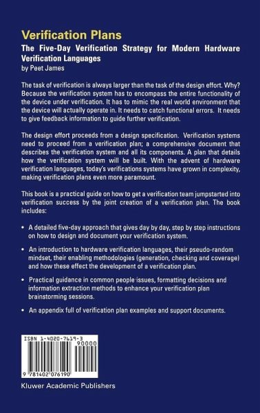 "In this book, Peet gives every engineer trying to do functional verification a jump-start on getting it under control...His technique...is soundly grounded in the real world, honed through years of experience and practice. If you adopt this approach, it will improve the speed with which verification plans are produced, improve their quality, help eliminate redundant work, and reduce unnecessary work...But wait, there's more. Peet not only tells you how to do it, he tells you why you should do it a certain way, and why Hardware Verification Languages give you an advantage (motivation for you to check out the new techniques and ammunition for your presentations to management)...I have been helped already by what Peet gives in his book. I'm keeping my copy right next to Janick's book." (Glenn Hunt, Texas Instruments)