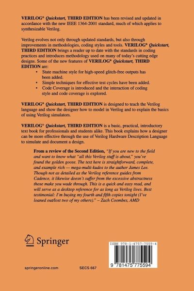 From a review of the Second Edition `If you are new to the field and want to know what "all this Verilog stuff is about," you've found the golden goose. The text here is straight forward, complete, and example rich -mega-multi-kudos to the author James Lee. Though not as detailed as the Verilog reference guides from Cadence, it likewise doesn't suffer from the excessive abstractness those make you wade through. This is a quick and easy read, and will serve as a desktop reference for as long as Verilog lives. Best testimonial: I'm buying my fourth and fifth copies tonight (I've loaned out/lost two of my others).' Zach Coombes, AMD