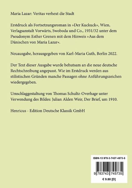 Maria Lazar: Veritas verhext die StadtErstdruck als Fortsetzungsroman in »Der Kuckuck«, Wien, Verlagsanstalt Vorwärts, Swoboda und Co., 1931/32 unter dem Pseudonym Esther Grenen mit dem Hinweis »Aus dem Dänischen von Maria Lazar«.Neuausgabe, herausgegeben von Karl-Maria Guth, Berlin 2023.Der Text dieser Ausgabe wurde behutsam an die neue deutsche Rechtschreibung angepasst. Wie im Erstdruck werden aus stilistischen Gründen manche Passagen ohne Anführungszeichen wiedergegeben.Umschlagabbildung: Julian Alden Weir, Der Brief, um 1910Gesetzt aus der Minion Pro, 11 pt.Die Sammlung Hofenberg erscheint im Verlag Henricus - Edition Deutsche Klassik GmbH, Berlin