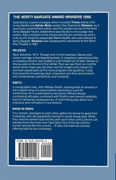Selected by a panel of judges which included Times drama critic Irving Wardle and Adrian Mole creator Sue Townsend, Releevo, by a previously unperformed author, was the outright winner of the third Verity Bargate Award, established specifically to encourage new writers. Also included in this volume are the two runners-up and a note on the award by playwright Barry Keeffe, who was married to Verity Bargate. Plays included: Releevo by David Spencer Smith by Johnnie Quarrell Made in Spain by Tony Grounds