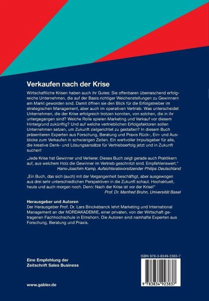"Jede Krise hat Gewinner und Verlierer. Dieses Buch zeigt gerade auch Praktikern auf, aus welchem Holz die Gewinner im Vertrieb geschnitzt sind. Empfehlenswert." Hans-Joachim Kamp, Aufsichtsratsvorsitzender Philips Deutschland "Ein Buch, das sich (auch) mit der Vergangenheit beschäftigt, aber ausgewogen aus drei sehr unterschiedlichen Perspektiven in die Zukunft schaut. Hochaktuell, heute und auch morgen noch. Denn: Nach der Krise ist vor der Krise!" Prof. Dr. Manfred Bruhn, Universität Basel