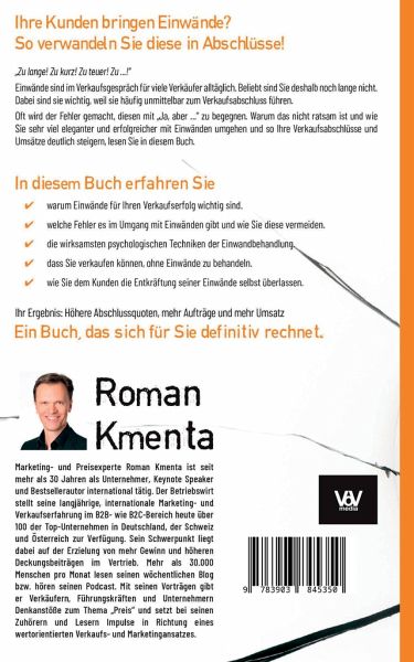 Nicht TROTZ sondern MIT Einwänden mehr VerkaufsabschlüsseWollen Sie lernen wie Sie Kundeneinwände reduzieren?Wollen Sie mit Einwänden ohne Widerstand umgehen?Wollen Sie abschließen, OHNE Einwände zu behandeln?Dann sollten Sie vieles von dem, was Sie bisher über Einwände gehört haben vergessen!In diesem Buch erfahren Sie,_ warum Einwände für Ihren Verkaufserfolg wichtig sind._ welche Fehler es im Umgang mit Einwänden gibt und wie Sie diese vermeiden._ die wirksamsten psychologischen Techniken der Einwandbehandlung._ dass Sie verkaufen können, ohne Einwände zu behandeln._ wie Sie dem Kunden die Entkräftung seiner Einwände selbst überlassen.All das und noch viel mehr können Sie mit den Strategien zur Einwandbehandlung in diesem Buch erreichen. Lassen Sie sich überraschen. Sie werden staunen.