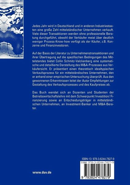 Auf der Basis der Literatur zu Unternehmenstransaktionen und ihrer Übertragung auf die spezifischen Bedingungen des Mittelstandes bietet Collin Schmitz-Valckenberg eine systematische und detaillierte Darstellung des M&A-Prozesses aus Verkäufersicht. Er präsentiert einen theoretisch idealtypischen Verkaufsprozess für ein mittelständisches Unternehmen, den er anhand einer empirischen Untersuchung überprüft. Aus den gewonnenen Erkenntnissen leitet der Autor Empfehlungen zur Gestaltung des Verkaufsprozesses und des Kaufpreises ab.