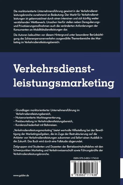 "Verkehrsdienstleistungsmarketing" bietet wertvolle Hilfestellung bei der Bewältigung der Marketingaufgaben, die im Zuge der Restrukturierung auf die Anbieter von Verkehrsdienstleistungen zukommen und liefert einen Ausblick in die Zukunft. Das Buch wird durch eine Fallstudie abgerundet.