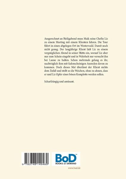 Ausgerechnet an Heiligabend muss Maik seine Chefin Liz zu einem Meeting mit einem Klienten fahren. Die Tour führt in einen abgelegen Ort im Westerwald. Damit noch nicht genug. Der langjährige Klient lädt Liz zu einem vergnüglichen Abend in seiner Hütte ein, worauf Liz aber nur zum Schein eingeht und in Wahrheit nur versucht ihn bei Laune zu halten. Schon mehrmals gelang es ihr, nachträglich ihm mit fadenscheinigen Ausreden davon zu kommen. Doch dieses Mal überlässt der Klient nichts dem Zufall und stellt so die Weichen, ohne zu ahnen, dass er und Liz Opfer eines bösen Komplotts werden sollen.Scharfzüngig und amüsant.