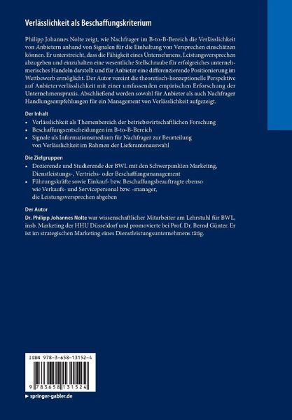 Philipp Johannes Nolte zeigt, wie Nachfrager imB-to-B-Bereich die Verlässlichkeit von Anbietern anhand von Signalen für dieEinhaltung von Versprechen einschätzen können. Er unterstreicht, dass dieFähigkeit eines Unternehmens, Leistungsversprechen abzugeben und einzuhalteneine wesentliche Stellschraube für erfolgreiches unternehmerisches Handelndarstellt und für Anbieter eine differenzierende Positionierung im Wettbewerbermöglicht. Der Autor vereint die theoretisch-konzeptionelle Perspektive aufAnbieterverlässlichkeit mit einer umfassenden empirischen Erforschung derUnternehmenspraxis. Abschließend werden sowohl für Anbieter als auch NachfragerHandlungsempfehlungen für ein Management von Verlässlichkeit aufgezeigt.
