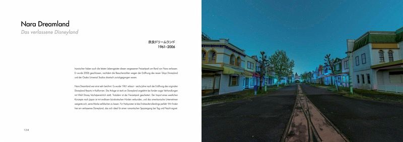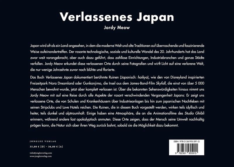 Jordy Meow hat diese vergessenen Orte besucht und führt uns mit seinen Aufnahmen in eine verlorene Welt, die vor nicht allzu langer Zeit noch im Aufschwung begriffen war. Abandoned Japan stellt damit eine wertvolle Quelle von Bildern dieser aufgegebenen (auf Japanisch haikyo genannten) Orte dar. Man sieht die durch den James-Bond-Film Skyfall berühmt gewordene, heute verlassene Insel Gunkanjima, auf der einst 5000 Menschen lebten, oder den von Disneyland inspirierten Freizeitpark Nara Dreamland. Neben diesen spektakulären Orten richtet Jordy Meow den Blick jedoch auch auf die Aspekte einer schnell untergehenden Vergangenheit, auf Schulen, Krankenhäuser und Industrieanlagen oder auf das Nachtleben mit seinen Stripteaseclubs und alten Hotels.