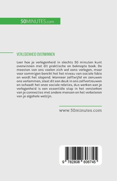 Leer hoe je verlegenheid in slechts 50 minuten kunt overwinnen met dit praktische en beknopte boek. De meesten van ons voelen zich wel eens verlegen, maar voor sommigen bereikt het het niveau van sociale fobie en wordt het slopend. Wanneer zelftwijfel en zenuwen ons verlammen, slaat dit een deuk in ons zelfvertrouwen en schaadt het onze sociale relaties, dus werken aan je verlegenheid is een essentiële stap in het versterken van je connecties met andere mensen en het verbeteren van je algehele welzijn. In dit boek leer je over een reeks verschillende methoden om met verlegenheid om te gaan, waaronder therapie, werken aan je communicatievaardigheden en bepaalde soorten medicatie. Het bevat ook nuttige tips om uit je comfortzone te stappen en advies voor interactie met nieuwe mensen, waardoor je de tools krijgt die je nodig hebt om verlegenheid en sociale angst te overwinnen.