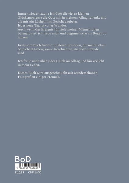 Schreiben war schon immer eine große Leidenschaft von mir. Ich liebe es, meine Erlebnisse mit anderen zu teilen. Ich habe gemerkt, dass ich meinen Tag viel bewusster erlebe, weil ich immer gespannt bin, welchen Glückmoment Gott für mich bereithält. Ich liebe mein Leben! Ich bin gerne unterwegs, per Fahrrad oder zu Fuß. Auch wenn es immer wieder Hürden zu überwinden gibt, weiß ich, dass auch daraus etwas Gutes entstehen kann. Das Aufschreiben hilft mir, dem Vergessen vorzubeugen und Erfahrenes nachzuerleben. Ich will mir durch das Schreiben auch bewusst machen, dass es mehr Gründe zur Freude als Probleme gibt. Ich will auch glauben, dass es mehr Möglichkeiten als Unmöglichkeiten gibt. Dieses Buch soll dir etwas Farbe in deinen Alltag bringen. Es ist mein Wunsch, dass du dadurch aufgemuntert und inspiriert wirst.