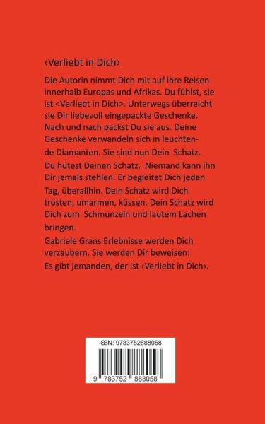 Die Autorin nimmt Dich mit auf ihre Reisen innerhalb Europas und Afrikas. Du fühlst, sie ist"Verliebt in Dich". Unterwegs überreicht sie Dir liebevoll eingepackte Geschenke. Nach und nach packst Du sie aus. Deine Geschenke verwandeln sich in leuchtende Diamanten. Sie sind nun Dein Schatz. Du hütest Deinen Schatz. Niemand kann ihn Dir jemals stehlen. Er begleitet Dich jeden Tag, überallhin. Dein Schatz wird Dich trösten, umarmen, küssen. Dein Schatz wird Dich zum Schmunzeln und lautem Lachen bringen. Gabriele Grans Erlebnisse werden Dich verzaubern. Sie werden Dir beweisen: Es gibt jemanden, der ist "Verliebt in Dich".