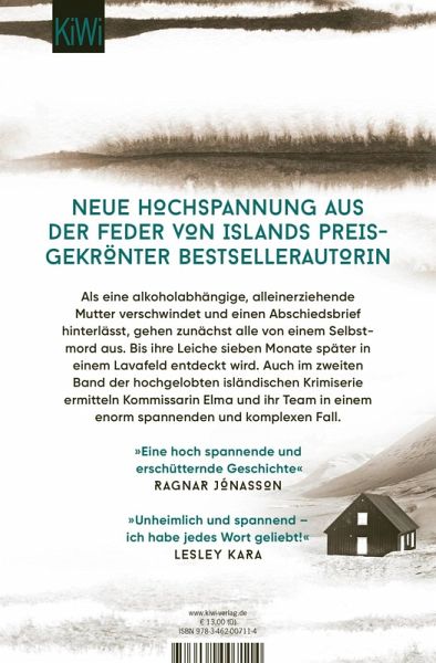 Eigentlich will Kommissarin Elma nach einem persönlichen Schicksalsschlag in ihrer Heimatstadt Akranes zur Ruhe kommen. Doch als Spaziergänger in einem Lavafeld die Überreste einer Frau entdecken, die vor Monaten verschwunden ist, wird sie sofort in einen neuen, erschütternden Fall hineingezogen.