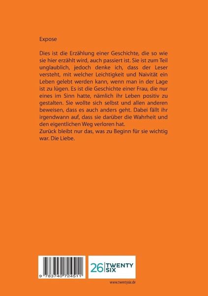 Dies ist die Erzählung einer Geschichte, die so wie sie hier erzählt wird, auch passiert ist. Sie ist zum Teil unglaublich, jedoch denke ich, dass der Leser versteht, mit welcher Leichtigkeit und Naivität ein Leben gelebt werden kann, wenn man in der Lage ist zu lügen. Es ist die Geschichte einer Frau, die nur eines im Sinn hatte, nämlich ihr Leben positiv zu gestalten. Sie wollte sich selbst und allen anderen beweisen, dass es auch anders geht. Dabei fällt ihr irgendwann auf, dass sie darüber die Wahrheit und den eigentlichen Weg verloren hat. Zurück bleibt nur das, was zu Beginn für sie wichtig war. Die Liebe.