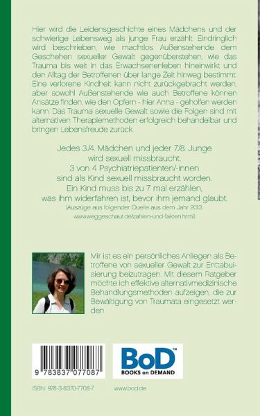 Hier wird die Leidensgeschichte eines Mädchens und der schwierige Lebensweg als junge Frau erzählt. Eindringlich wird beschrieben, wie machtlos Außenstehende dem Geschehen sexueller Gewalt gegenüberstehen, wie das Trauma bis weit in das Erwachsenenleben hineinwirkt und den Alltag der Betroffenen über lange Zeit hinweg bestimmt. Eine verlorene Kindheit kann nicht zurückgebracht werden, aber sowohl Außenstehende wie auch Betroffene können Ansätze finden, wie den Opfern - hier Anna - geholfen werden kann. Das Trauma sexuelle Gewalt sowie die Folgen sind mit alternativen Therapiemethoden erfolgreich behandelbar und bringen Lebensfreude zurück.Jedes 3./4. Mädchen und jeder 7./8. Junge wird sexuell missbraucht. 3 von 4 Psychiatriepatienten/-innen sind als Kind sexuell missbraucht worden. Ein Kind muss bis zu 7 Mal erzählen, was ihm widerfahren ist, bevor ihm jemand glaubt. (Auszüge aus folgender Quelle aus dem Jahr 2013: www.weggeschaut.de/zahlen-und-fakten.html) Mir ist es ein persönliches Anliegen als Betroffene von sexueller Gewalt zur Enttabuisierung beizutragen. Mit diesem Ratgeber möchte ich effektive alternativmedizinische Behandlungsmethoden aufzeigen, die zur Bewältigung von Traumata eingesetzt werden.