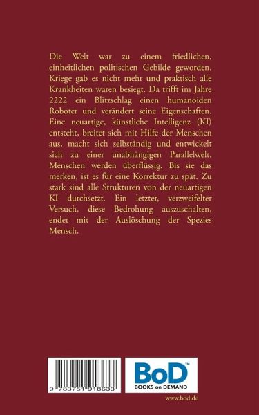 Die Welt war zu einem friedlichen, einheitlichen politischen Gebilde geworden. Kriege gab es nicht mehr und praktisch alle Krankheiten waren besiegt. Da trifft im Jahre 2222 ein Blitzschlag einen humanoiden Roboter und verändert seine Eigenschaften. Eine neuartige, künstliche Intelligenz (KI) entsteht, breitet sich mit Hilfe der Menschen aus, macht sich selbständig und entwickelt sich zu einer unabhängigen Parallelwelt. Menschen werden überflüssig. Bis sie das merken, ist es für eine Korrektur zu spät. Zu stark sind alle Strukturen von der neuartigen KI durchsetzt. Ein letzter, verzweifelter Versuch, diese Bedrohung auszuschalten, endet mit der Auslöschung der Spezies Mensch.