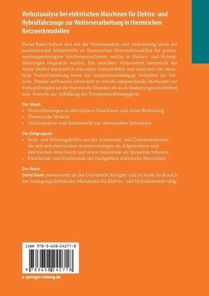 David Bauer befasst sich mit der Verlustanalyse und -berechnung sowie der resultierenden Schnittstelle zu thermischen Netzwerkmodellen bei permanentmagneterregten Synchronmaschinen, welche in Elektro- und Hybridfahrzeugen eingesetzt werden. Die einzelnen Verlustarten untersucht der Autor hierbei hinsichtlich relevanter Verlusteffekte und analysiert die räumliche Verlustverteilung sowie das temperaturabhängige Verhalten der Verluste. Darauf aufbauend entwickelt er sowohl entsprechende Methoden zur Verlustübergabe an die thermische Domäne als auch Skalierungsvorschriften und -formeln zur Abbildung der Temperaturabhängigkeit.