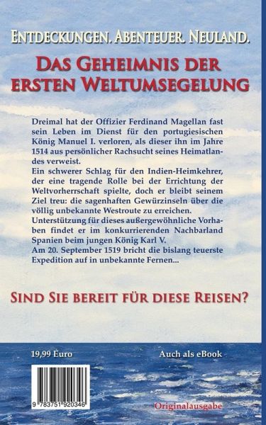 Die erste Umsegelung der Welt im Jahre 1521 - und das Leben des Mannes, der diese Tat umsetzte.Dreimal hat der Offizier Ferdinand Magellan fast sein Leben im Dienst für den portugiesischen König Manuel I. verloren, als dieser ihn im Jahre 1514 aus persönlicher Rachsucht seines Heimatlandes verweist. Ein schwerer Schlag für den Indien-Heimkehrer, der eine tragende Rolle bei der Errichtung der Weltvorherrschaft spielte, doch er bleibt seinem Ziel treu: die sagenhaften Gewürzinseln über die bis dahin noch unbekannte Westroute zu erreichen. Unterstützung für dieses außergewöhnliche Vorhaben findet er im konkurrierenden Nachbarland Spanien beim jungen König Karl V.Am 19. September 1519 bricht die bislang teuerste Expedition auf in unbekannte Fernen...