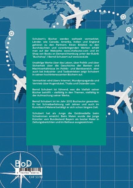 Schubert´s Bücher werden weltweit vermarktet. Länder, wie Canada, Amerika, Indien und England gehören zu den Partnern. Einen Einblick zu den durchdachten und voranbringenden Werken erhält man auf der Webseite: www.chefautor.com und im Shop von Books on Demand Hamburg unter der Rubrik "Buchshop" / Bernd Schubert auf www.bod.deUnzählige Werke über das Leben, über Politik und über Sicherheit über die Geschichte der Banken und Machtverhältnisse im Politik- und Bankbereich, aber auch bei Industrie- und Taxibetrieben zeigt Schubert in seinen hochinteressanten Büchern auf.Vermarktet wird übers Internet, Mundpropaganda und Vertrieb über Hugendubel, Thalia und Osiander usw.Bernd Schubert ist führend, was die Vielfalt seiner Bücher betrifft - vielfältig in den Themen, vielfältig in der Aufmachung seiner Werke.Bernd Schubert ist im Jahr 2012 Buchautor geworden. Er hat Schreiberfahrung seit Jahren und auch im Kunstberuf Malerei betätigt er sich schon längere Zeit.Schubert hat als Junge die Goldmedaille beim Schwimmen erreicht. Beim Malen wurde der junge Künstler vom Bundesland Bayern als bester Maler in Zeitungsberichten und im Rathaus ausgezeichnet.