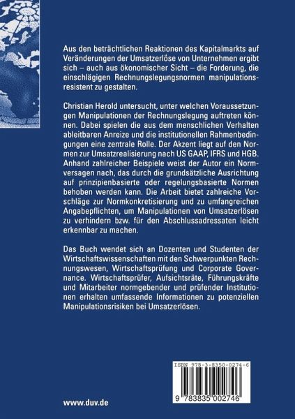 Christian Herold untersucht, unter welchen Voraussetzungen Manipulationen der Rechnungslegung auftreten können. Dabei spielen die aus dem menschlichen Verhalten ableitbaren Anreize und die institutionellen Rahmenbedingungen eine zentrale Rolle. Der Akzent liegt auf den Normen zur Umsatzrealisierung nach US GAAP, IFRS und HGB. Anhand zahlreicher Beispiele weist der Autor ein Normversagen nach, das durch die grundsätzliche Ausrichtung auf prinzipienbasierte oder regelungsbasierte Normen behoben werden kann. Die Arbeit bietet zahlreiche Vorschläge zur Normkonkretisierung und zu umfangreichen Angabepflichten, um Manipulationen von Umsatzerlösen zu verhindern bzw. für den Abschlussadressaten leicht erkennbar zu machen.
