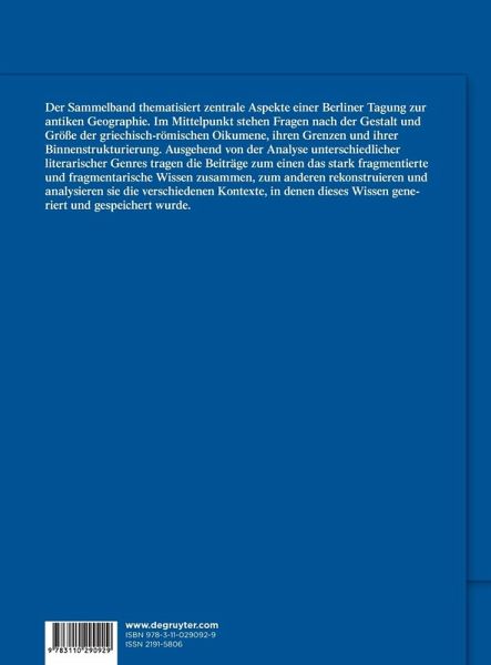 Mit diesem Ausgangspunkt für eine internationale Tagung im Oktober 2010 in Berlin stehen nun im Mittelpunkt des inhaltlich erweiterten Tagunsgbandes Fragen nach der Gestalt und Größe der griechisch-römischen Oikumene, ihren Grenzen und ihrer Binnenstrukturierung. Ausgehend von der Analyse unterschiedlicher literarischer Genres tragen die Beiträge zum einen das stark fragmentierte und fragmentarische Wissen zusammen, zum anderen rekonstruieren und analysieren sie die verschiedenen Kontexte, in denen dieses Wissen generiert und gespeichert wurde.