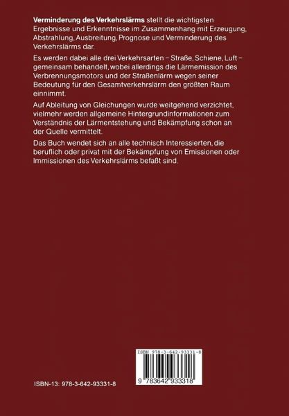 Das Werk stellt die wichtigsten Ergebnisse und Erkenntnisse im Zusammenhang mit Erzeugung, Abstrahlung, Ausbreitung, Prognose und Verminderung des Verkehrslärms dar. Auf Ableitung von Gleichungen wurde weitgehend verzichtet, vielmehr werden allgemeine Hintergrundinformationen zum Verständnis der Lärmentstehung und -bekämpfung schon an der Quelle vermittelt. Es werden dabei alle drei Verkehrsarten - Straße, Schiene, Luft - gemeinsam behandelt, wobei allerdings die Lärmemission des Verbrennungsmotors und der Straßenlärm wegen seiner Bedeutung für den Gesamtverkehrslärm den größten Raum einnehmen. Das Buch wendet sich an alle technisch Interessierten, die beruflich oder privat mit der Bekämpfung von Emissionen oder Immissionen des Verkehrslärms befaßt sind.