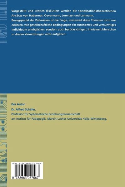 Vorgestellt und kritisch diskutiert werden die sozialisationstheoretischen Ansätze von Habermas, Oevermann, Lorenzer und Luhmann. Bezugspunkt der Diskussion ist die Frage, inwieweit diese Theorien nicht nur erklären, wie gesellschaftliche Bedingungen ein autonomes und vernünftiges Individuum ermöglichen, sondern auch berücksichtigen, inwieweit Menschen in diesen Vermittlungen nicht aufgehen.