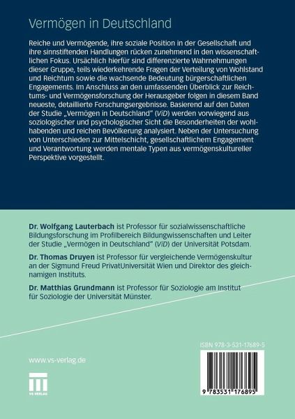 Im Buch "Vermögen in Deutschland. Heterogenität und Verantwortung" werden die neuesten Erkenntnisse zu den Daten der Studie "Vermögen in Deutschland" (ViD) präsentiert, die erstmals einen detaillierten Einblick in die Besonderheiten der wohlhabenden und reichen Bevölkerung bieten. In den Beiträgen von Soziologen und Psychologen werden Unterschiede zur Mittelschicht, gesellschaftliches Engagement sowie Verantwortung untersucht und mentale Typen aus der Perspektive der Vermögenskultur vorgestellt.