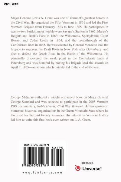 Major General Lewis A. Grant was one of Vermont's greatest heroes in the Civil War. He organized the Fifth Vermont in 1861 and led the First Vermont Brigade from February 1863 to June 1865. He participated in 22 battles; most notable were Savage's Station in 1862, Marye's Heights and Bank's Ford in 1863, the Wilderness, Spotsylvania Court House, and Cedar Creek in 1864, and the breakthrough of the Confederate lines in 1865. He was selected by General Meade to lead the brigade to suppress the Draft Riots in New York after Gettysburg, and also, to defend the Brock Road in the Battle of the Wilderness. He personally discovered the weak point in the Confederate lines at Petersburg and was honored by having his brigade lead the assault on April 2, 1865, action which quickly led to the end of the war.