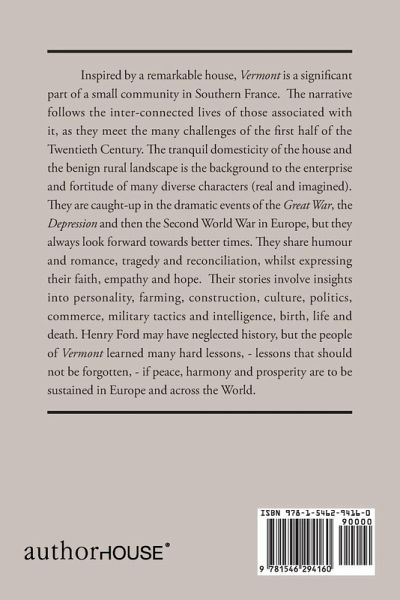Inspired by a remarkable house, Vermont is a significant part of a small community in Southern France. The narrative follows the inter-connected lives of those associated with it, as they meet the many challenges of the first half of the Twentieth Century. The tranquil domesticity of the house and the benign rural landscape is the background to the enterprise and fortitude of many diverse characters (real and imagined). They are caught-up in the dramatic events of the Great War, the Depression and then the Second World War in Europe, but they always look forward towards better times. They share humour and romance, tragedy and reconciliation, whilst expressing their faith, empathy and hope. Their stories involve insights into personality, farming, construction, culture, politics, commerce, military tactics and intelligence, birth, life and death. Henry Ford may have neglected history, but the people of Vermont learned many hard lessons, - lessons that should not be forgotten, - if peace, harmony and prosperity are to be sustained in Europe and across the World.