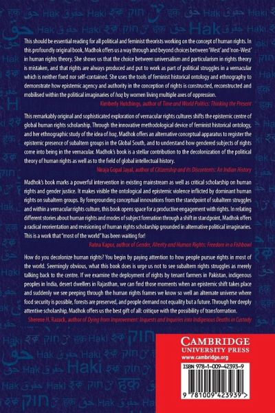 The book proposes that decolonising human rights requires historically and politically specific conceptual, empirical and theoretical investigations of rights politics. It tracks contemporary subaltern movements across India and Pakistan to show how and why marginalised groups deploy the language of rights to demand justice.
