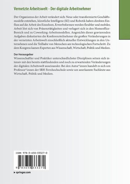 Wissenschaftler und Praktiker unterschiedlichster Disziplinen setzen sich intensiv mit den bereits stattfindenden und noch zu erwartenden Veränderungen der digitalen Arbeitswelt auseinander.Bei den Autor*innen handelt es sich um Professor*innen der SRH Fernhochschule sowie um anerkannte Fachleute aus Wirtschaft, Politik und Medien.