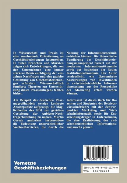und Gang der Untersuchung.- 1. Grundlagen.- 1.1. Das Management von Geschäftsbeziehungen als konsequente Realisierung einer marktorientierten Unternehmensführung.- 1.2. Ein leistungstheoretisches Konzept als Analysegrundlage und Integrativität als Ursache für Vermarktungsbesonderheiten.- 1.3 Elektronischer Datenaustausch zur Realisierung informationstechnisch "vernetzter" Geschäftsbeziehungen.- 2. Geschäftsbeziehungsmanagement bei integrativer Leistungserstellung.- 2.1. Ausgewählte Beiträge der Neuen Institutionenökonomie zur Ableitung konkreter Handlungsempfehlungen.- 2.2. Das Management von Geschäftsbeziehungen im Rahmen des Konzeptes der integrativen Leistungserstellung.- 3. Der Beitrag der Informations- und Kommunikationstechnik zur Gestaltung von Geschäftsbeziehungen.- 3.1. Analyse grundsätzlicher Anwendungsvoraussetzungen und -möglichkeiten von EDI.- 3.2. Bindungsmanagement des Anbieters zur Steuerung der gewünschten Nachfragerbindung.- 3.3. EDI im Rahmen des Angebotsmanagement zur Gestaltung der Leistungsfähigkeit eines Anbieters und seiner Bindung an einzelne Nachfrager.- 3.4. Ansätze zur Beurteilung der ökonomischen Auswirkungen des Einsatzes von EDI.- 4. Das Beispiel des deutschen Pharmagroßhandels.- 4.1. Der Pharmagroßhandel in Deutschland.- 4.2. Absatzbündel des Pharmagroßhandels und die Bedeutung von Informationen.- 4.3. Geschäftsbeziehungsmanagement als strategische Herausforderung des Pharmagroßhandels.- 4.4. Informationsmanagement als Teil des Angebotsmanagement des Pharmagroßhändlers zur internen Gestaltung der Leistungserstellung und Lenkung der Beziehungen zu Apotheken.- 4.5. Informationsmanagement als Teil des Bindungsmanagement zur absatzseitigen Gestaltung der Beziehung zwischen Apotheke und Pharmagroßhändler.-Fazit.- Anhang A: Exemplarische Definitionen und Charakterisierungen des Geschäftsbeziehungsmanagement.- Anhang B: Vergleichende Darstellung von Datennetzen der Deutschen Telekom.- Anhang C: Einflußfaktoren und aktueller Stand branchenspezifischer EDI-Diffusionsentwicklungen.