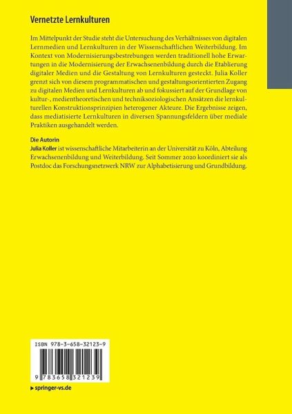 Im Mittelpunkt der Studie steht die Untersuchung des Verhältnisses von digitalen Lernmedien und Lernkulturen in der Wissenschaftlichen Weiterbildung. Im Kontext von Modernisierungsbestrebungen werden traditionell hohe Erwartungen in die Modernisierung der Erwachsenenbildung durch die Etablierung digitaler Medien und die Gestaltung von Lernkulturen gesteckt. Julia Koller grenzt sich von diesem programmatischen und gestaltungsorientierten Zugang zu digitalen Medien und Lernkulturen ab und fokussiert auf der Grundlage von kultur-, medientheoretischen und techniksoziologischen Ansätzen die lernkulturellen Konstruktionsprinzipien heterogener Akteure. Die Ergebnisse zeigen, dass mediatisierte Lernkulturen in diversen Spannungsfeldern über mediale Praktiken ausgehandelt werden.