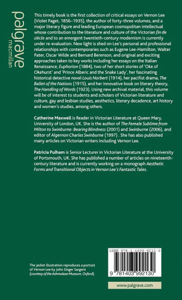 This, the first collection of essays on the aesthete and intellectual Vernon Lee, offers a wide range of critical writings by scholars. Key works are examined including Euphorion, Hauntings: Fantastic Stories and Music and Its Lovers . New light is shed on Lee's relationships with contemporaries such as Lee-Hamilton, Pater and Wilde.