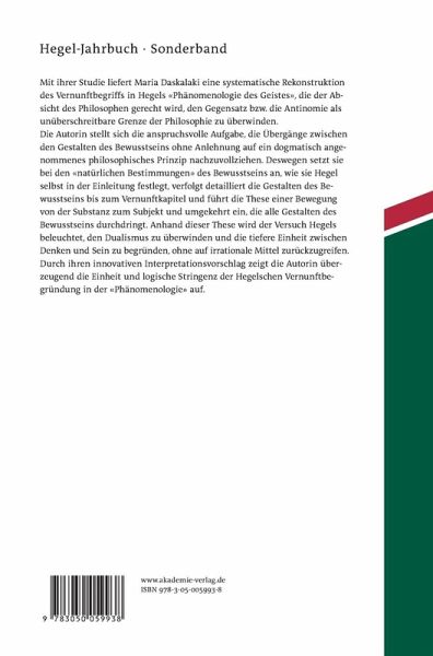 Mit ihrer Studie liefert Maria Daskalaki eine systematische Rekonstruktion des Vernunftbegriffs in Hegels "Phänomenologie des Geistes", die der Absicht des Philosophen gerecht wird, den Gegensatz bzw. die Antinomie als die unüberschreitbare Grenze der Philosophie zu überwinden. Insofern widerspricht sie nachdrücklich weit verbreiteten Interpretationen der "Phänomenologie", in denen die Einheit und logische Argumentationsstruktur des Werkes in Frage gestellt wird.
